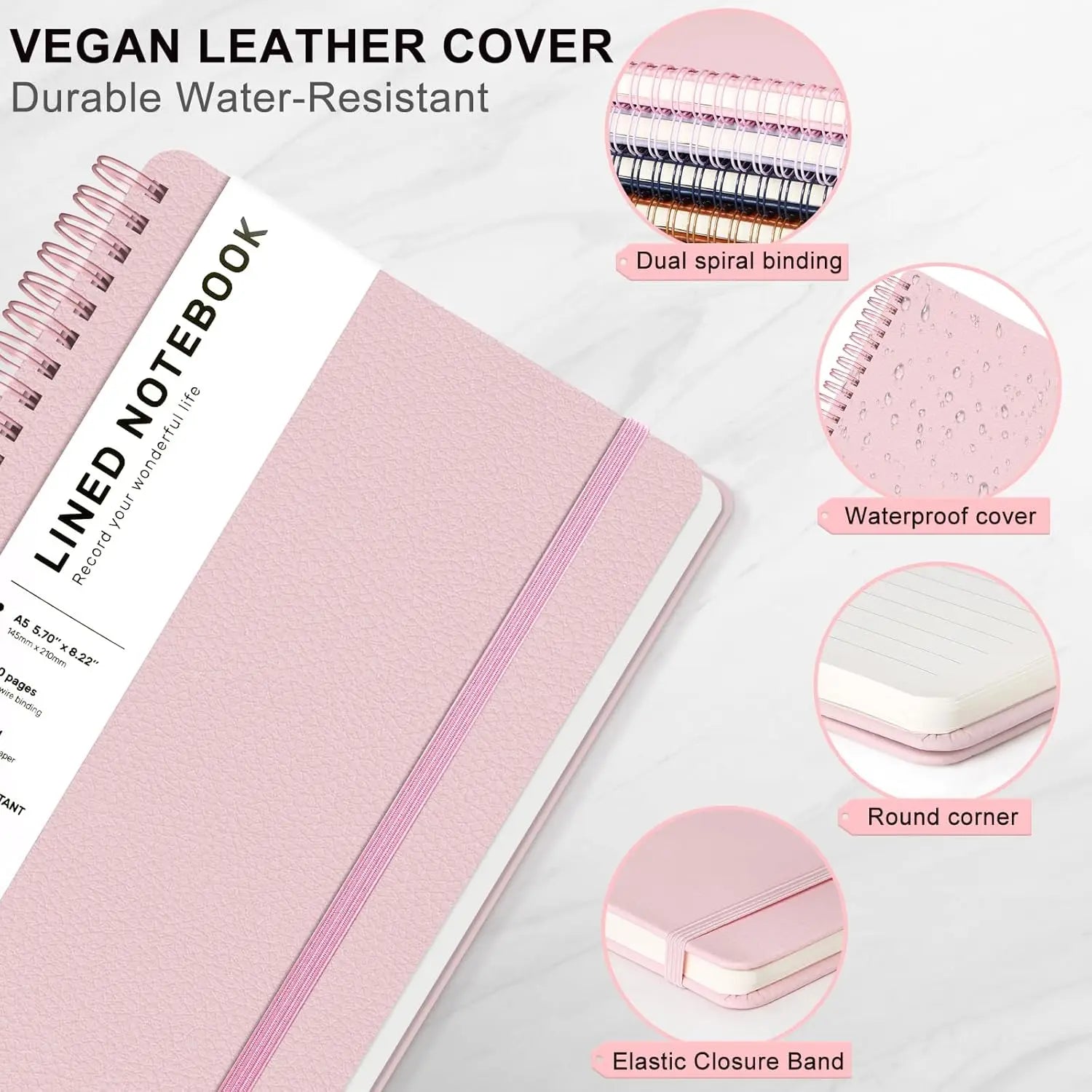 Discover our premium spiral notebook designed to enhance your writing and organizational experience. Key features include: 1. Durable and Stylish Design: This notebook features a sturdy, water-resistant vegan leather cover that protects the interior pages during daily use and travel. With dimensions of 8x5.7 inches (A5 size), it offers a smooth touch and elegant appearance, providing both visual appeal and practical functionality. 2. Versatile Use for Everyone: Ideal for women, men, students, professionals, and anyone seeking a reliable journal. Perfect as a gift for friends, family, or colleagues in various settings such as school, college, office, home meetings or personal projects. 3. High-Quality Paper: Includes 160 pages of thick light-colored paper that reduces glare ensuring comfortable writing without ink bleed-through from most pens or markers allowing double-sided usage to maximize space. 4. Practical Binding and Storage: Equipped with sturdy twin-wire spiral binding for easy page flipping flat laying and durability plus perforated pages for easy removal if needed An expandable inner pocket on the back cover stores small items while an external elastic band helps secure pages neatly. 5. Enhanced Organization: Helps bring order to your life by serving as a daily planner work log study notes travel diary or creative outlet making tasks more efficient through clear organized writing.